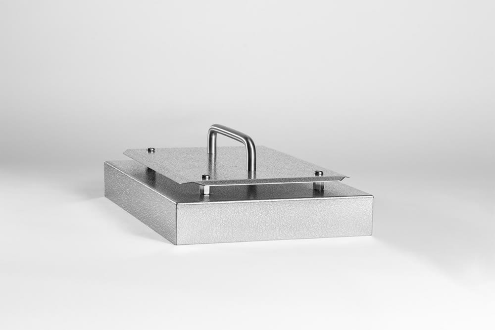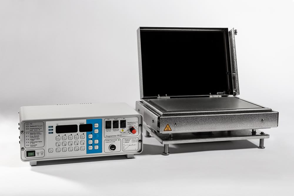 High-performance hotplate for temperatures of up to 600°C, short heat-up time (600°C in 20 minutes). Due to the elaborate insulation, the unit can also be placed on heat-sensitive standing surfaces. The insulated hinged lid considerably reduces heat loss. When the lid is closed, a gap of 26 mm (higher lid of request) remains to the heating plate surface, which allows intensive heating of flat parts at exact temperatures.The temperature control is carried out either with a temperature or program controller. The plate is kept constant at a set temperature throughout the entire control range with the temperature controller.