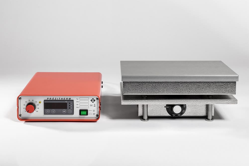 The table-top devices are manufactured as compact devices, i.e. the control is located directly in the housing under the heating plate. Thus the smallest possible space is taken up. All table-top devices are equipped with an adjustable safety device against overheating (50..300°C or 30..110°C PZ28-1). In the event of a fault, these overheating devices take over a so-called emergency control and thus protect the unit and the material from dangerous temperatures.