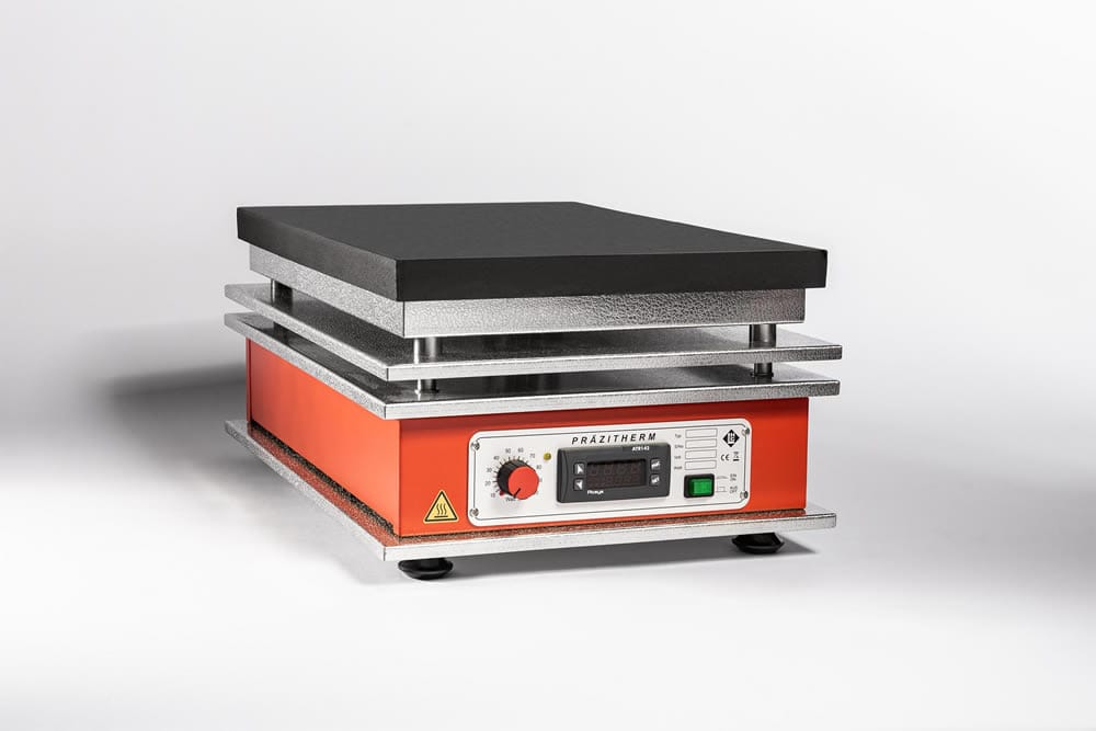 The heating surface of the precision hotplates are composed of an efficient heat conducting Aluminium alloy. The surface is smooth, easy to clean, and anodized. The built-in electric long-term heating is designed to provide a very homogeneous temperature distribution even at the corners and edges.